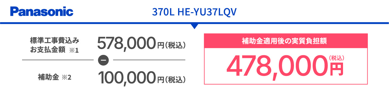 ※1 エコキュートからエコキュートへ交換する場合の設置工事、取扱説明、既存設備撤去·処分等。標準外工事が発生する場合は別途費用がかかります。 ※2 補助金とは、高効率給湯器導入促進による家庭部門の省エネルギー推進事業費補助金(給湯省エネ2026事業)を指します。2025年12月5日時点の情報。内容は変更になる可能性があります。補助金額は給湯省エネ2025事業と同じ要件で記載しております。補助金は設置工事完了後に申請を行い、交付決定後に当社からの振込となります。条件により、ご利用いただけない場合がございます。補助金は予算上限に達し次第終了になります。詳細はお問い合わせください。